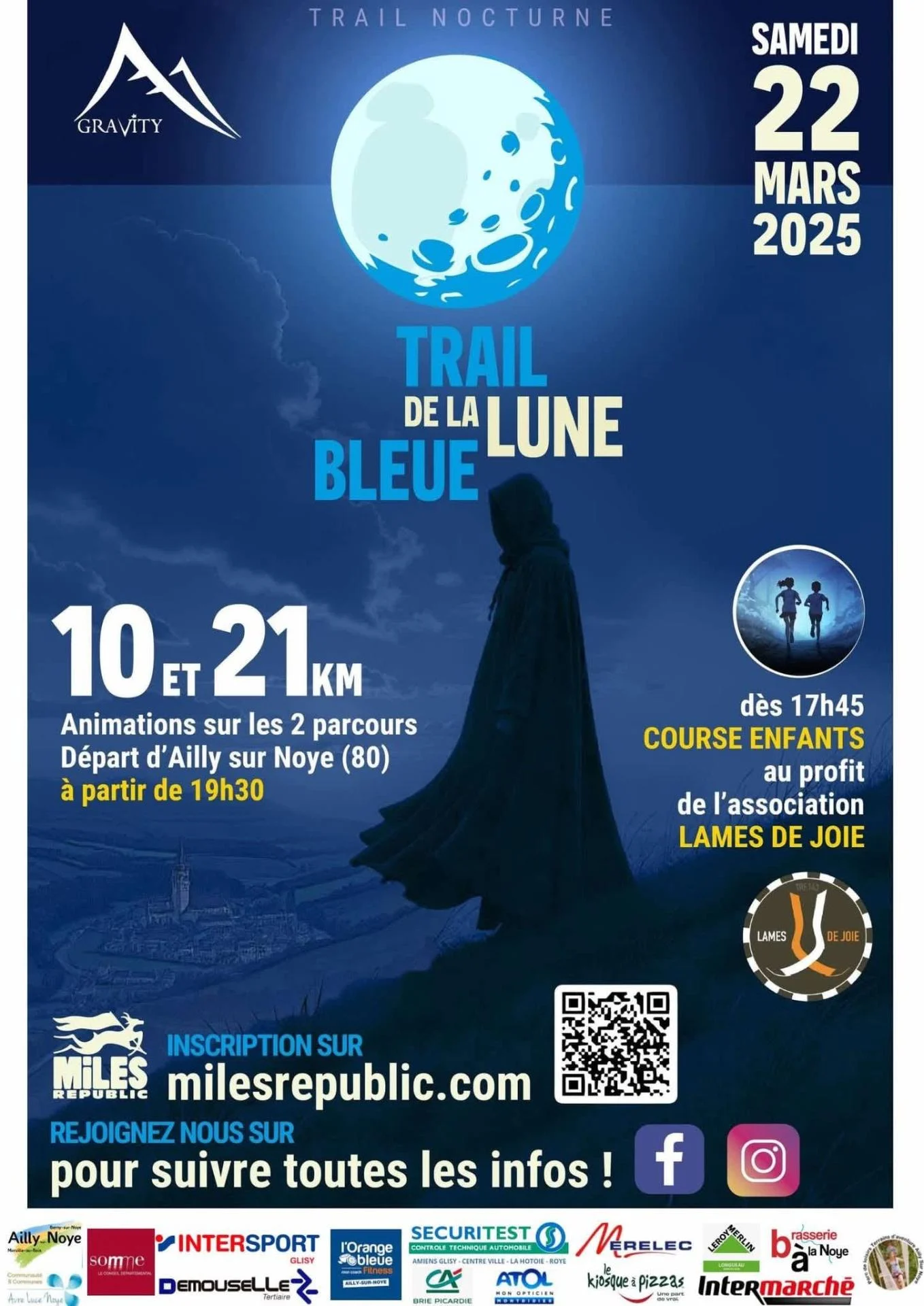 Le Trail de la Lune Bleue est un événement inédit lancé en 2025 à Ailly-sur-Noye. Pour sa première édition, il a rassemblé 1400 coureurs, venus vivre une expérience unique mêlant sport et légende locale. Trois formats sont proposés — courses enfants, 10 km et 21 km — afin de permettre à chacun de participer. Les bénéfices des courses enfants sont reversés à une association, donnant à l’événement une dimension solidaire.